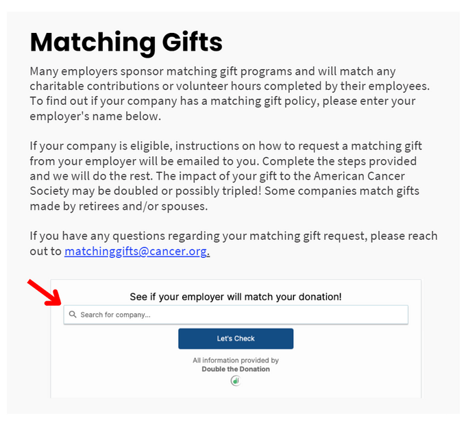 If your company is eligable, instructions on how to request a matching gift from your employer will be emailed to you. Complete the steps provided and we will do the rest. The impact of your gift to the American Cancer Society may be doubled or possibly tripled! Some companies match gifts made by retirees and/or spouses.