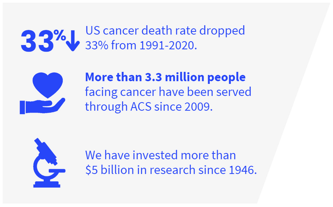 The American Cancer Society (ACS) is working to end cancer as we know it, for everyone. To make the most impact, we need the support of our community to help us continue investing in breakthrough research and supporting people with cancer by arranging free rides to cancer treatment, providing lodging near hospitals, and operating our 24/7 cancer helpline.